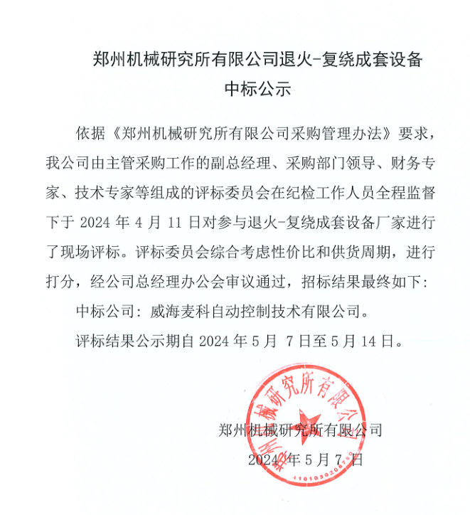 郑州机械研究所有限公司退火-复绕成套设备中标公示